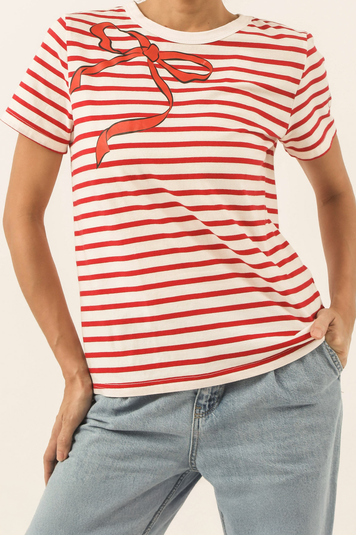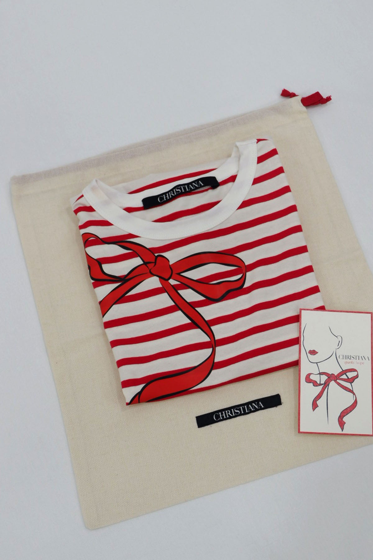 A classic stripe with a playful twist — finished with a bright red bow print that sparks a little joy. Easy, cheerful, and made to lift the everyday. Proceeds support our partner organization Happy2Help.