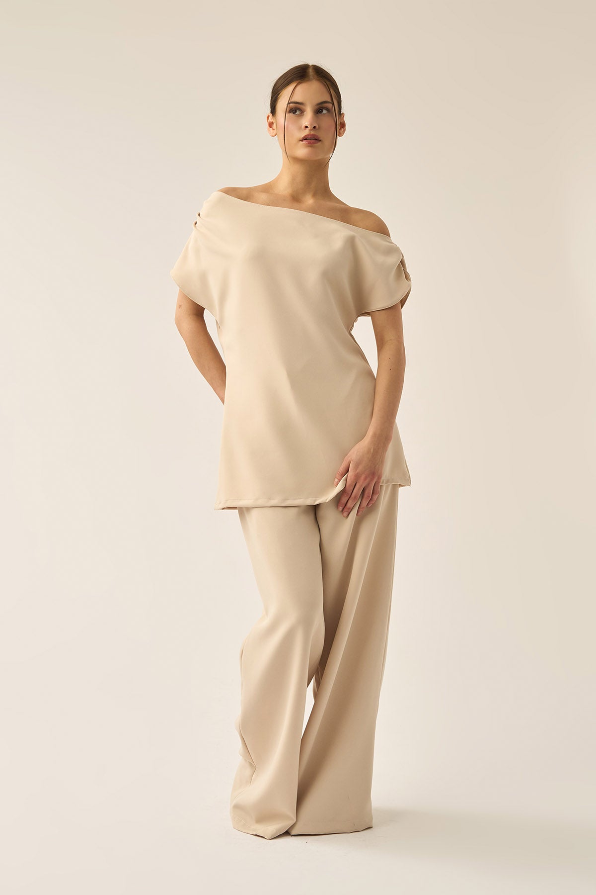 Fluid lines and soft movement define the Soria Pant Set. Designed with an off-shoulder top and wide-leg trousers, it’s an effortless choice for elevated evenings and graceful moments.